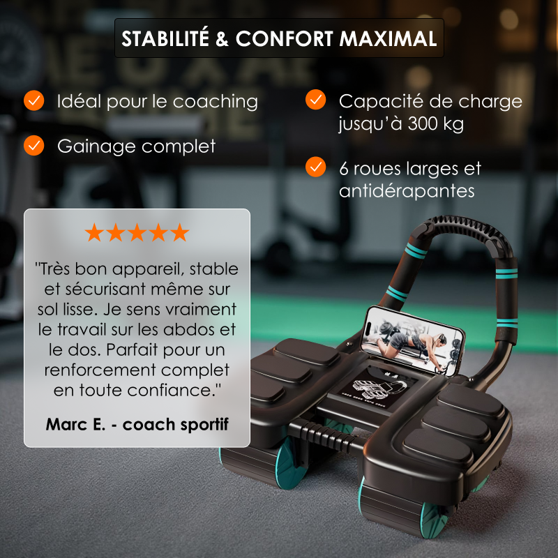 Conçue avec un châssis robuste en ABS, elle offre une stabilité inégalée grâce à ses six roues larges et antidérapantes, éliminant tout risque de glissement. Son design sécurisé et sa capacité de charge allant jusqu'à 300 kg permettent à vos clients de se concentrer sur leurs mouvements, sans craindre pour leur sécurité. Cet appareil polyvalent est idéal pour cibler les abdominaux, les obliques et les muscles du dos, pour un renforcement de tout le corps.