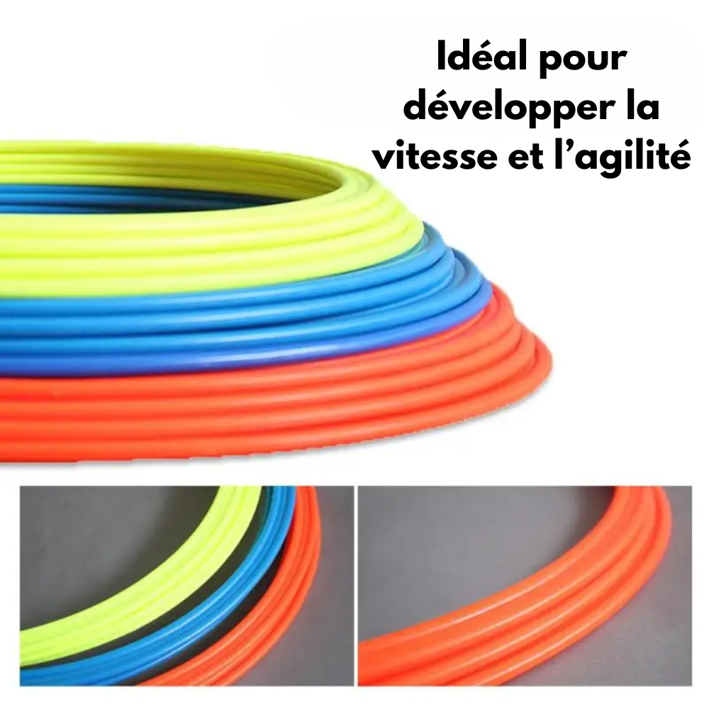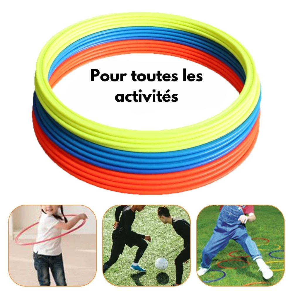 Ce set de cerceaux est un outil essentiel pour les coachs et éducateurs sportifs afin de matérialiser le terrain et structurer les entraînements. Il favorise le développement de l’agilité, de la coordination, ainsi que de la vitesse et de la motricité, adaptés aux besoins des plus jeunes comme des adultes. Léger et maniable, il permet de concevoir des exercices variés pour améliorer les compétences motrices de manière progressive et ciblée.